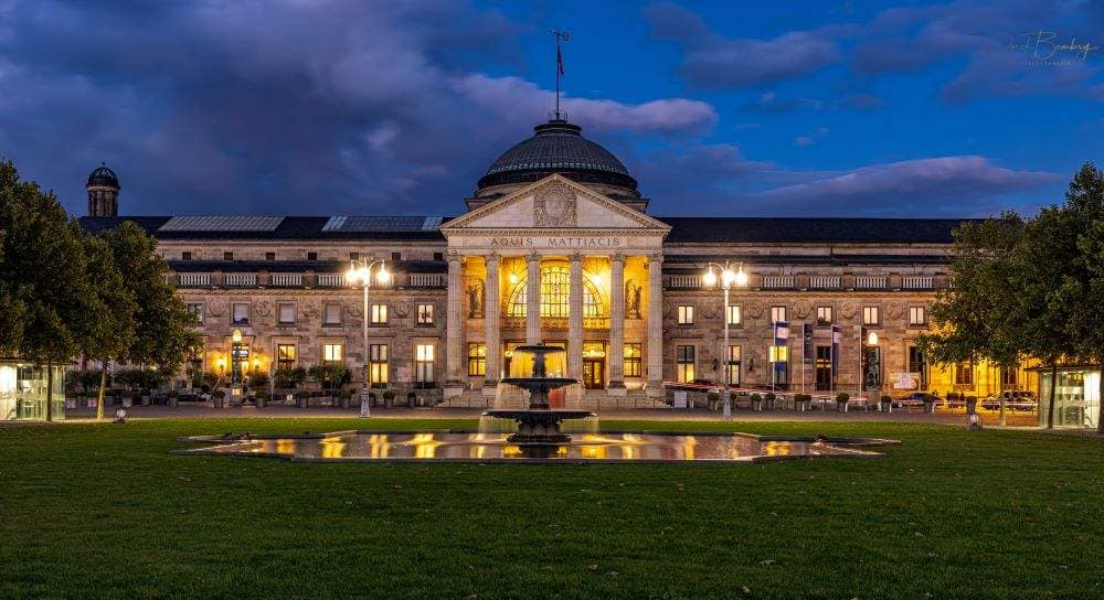 The Wiesbaden Kurhaus, landmark of an elegant city, is surrounded by a lot of green, and splendid historical buildings. 12 rooms and parlors of varying size and style, several restaurants and the Casino are all assembled under one roof, adjacent to the theater colonnades with the State Theater of Hesse built in the baroque style. The old Kurhaus was completed in 1810 and is a classicist building with a central portico and side corridors with columns. The building was designed and built by the architect Christian Zais. The building was even praised by Johann Wolfgang Goethe, who enjoyed numerous stays in the Kurhaus. In the 19th century Wiesbaden gained more and more reputation as a spa town. The old Kurhaus was demolished in 1905 and the new Kurhaus found its architect in Friedrich von Thiersch. He built the new house for about 6 million Goldmark. The new, splendid building could score with the style of the neoclassicism and numerous art nouveau motives. Emperor Wilhelm II promoted the construction and himself came to visit every year in May. At the opening of the new Kurhaus he called it “the most beautiful Kurhaus in the world”.
