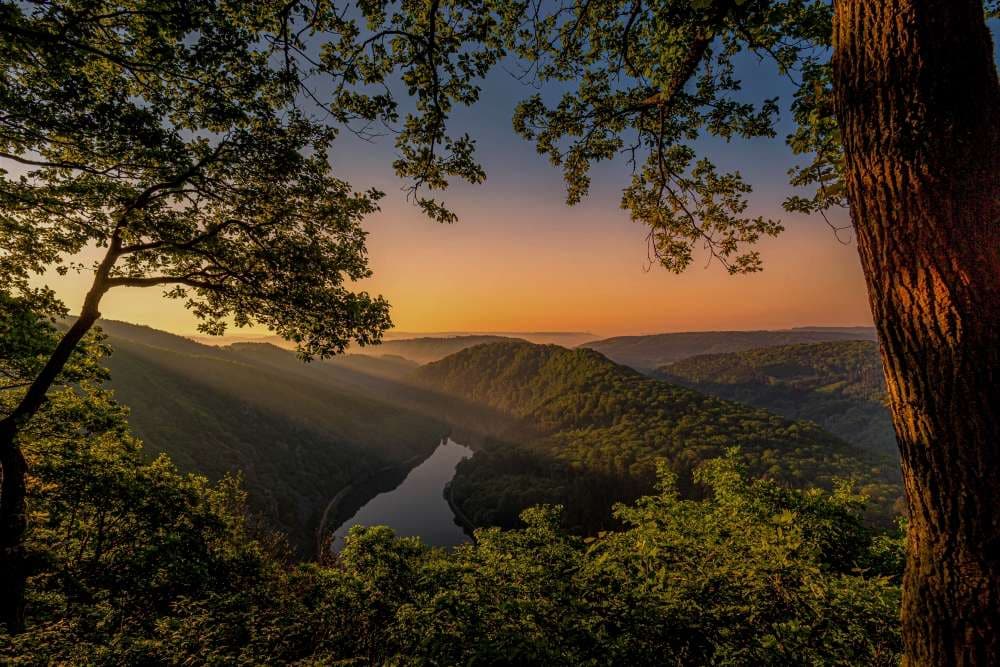 The Saarschleife, in contrast to the Kleine Saarschleife near Hamm (a district of Taben-Rodt) also called the Große Saarschleife near Mettlach, is a breakthrough valley of the Saar through the Taunus quartzite and is one of the most famous sights in the Saarland. The most popular view is the Cloef viewpoint, located 180 m high above the river in the Mettlach district of Orscholz. The shore is formed by rock faces, scree heaps and small ravines.